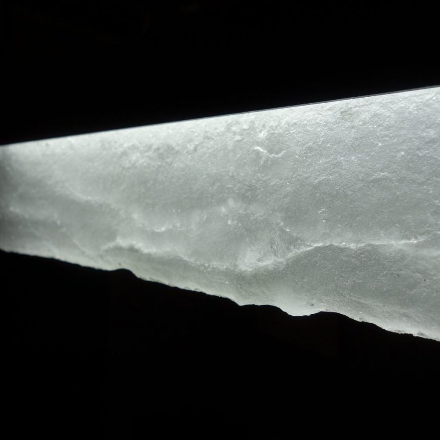 このガラス器は私達が調合した原料(珪砂・ソーダ・石灰等)を千数百度のルツボの中で溶かした素地を使い、宙吹き技法で作ったものです。宙吹き技法は、ルツボから竿(パイプ)に巻き取ったガラスに息を吹き込み、ガラス自体の動きと人の技とによって成形します。このため、デザイナーが考えた形を型によって正確に写しとる型吹き法やプレス法と違って、一定の形や大きさの品物を量産するには不向きですが、ひとつひとつの品物にそれぞれの個性や味わいが生まれると思います。出来上がった品物を手にしたとき、それが炎の色をした液体であったことや、竿(パイプ)に巻き取られ、息を吹き込まれてぐんぐんふくらんでいったことを、思い出させてくれるものであってほしいと願っています。
